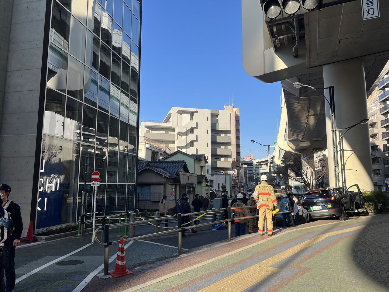 【現場の様子】#交通情報 国道17号線沿い 東京都板橋区板橋2丁目 板橋JCT付近 若葉マーク車両が歩道の街灯に突っ込む事故で周辺路地一時規制3月15日 #板橋