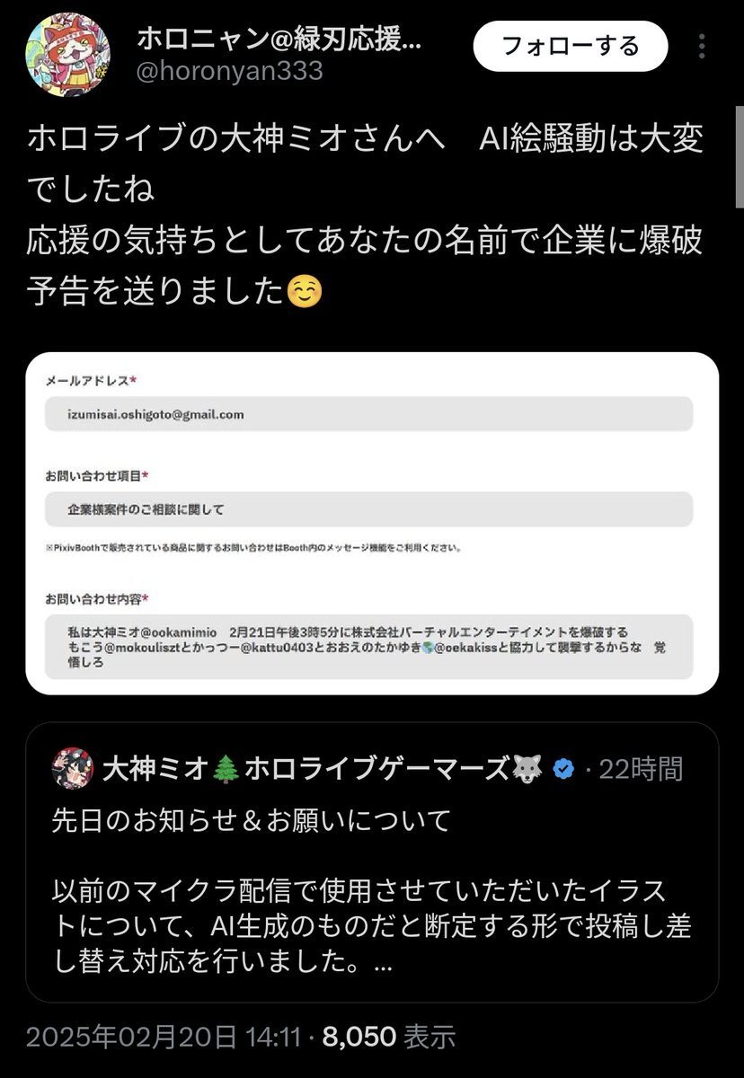 生成AI信者の方々は、ホロライブメンバーや会社に爆破予告殺害予告をする人間を確証なくファンだと決めつけるのですか? https://t.co/ibEgHP4F9m— KKK_KO (@MT1795938418782) February 20, 2025