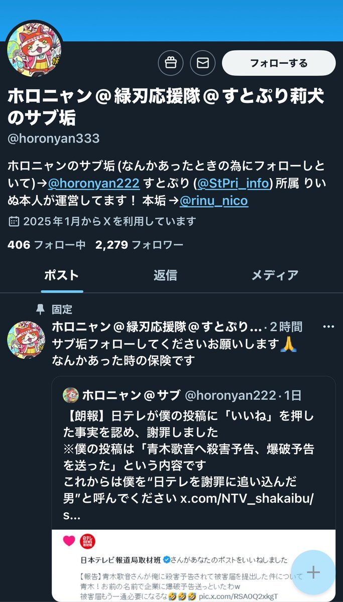 ホロニャン、メインのアカウントがようやく凍結くらったがサブアカウントがまだ生きている模様