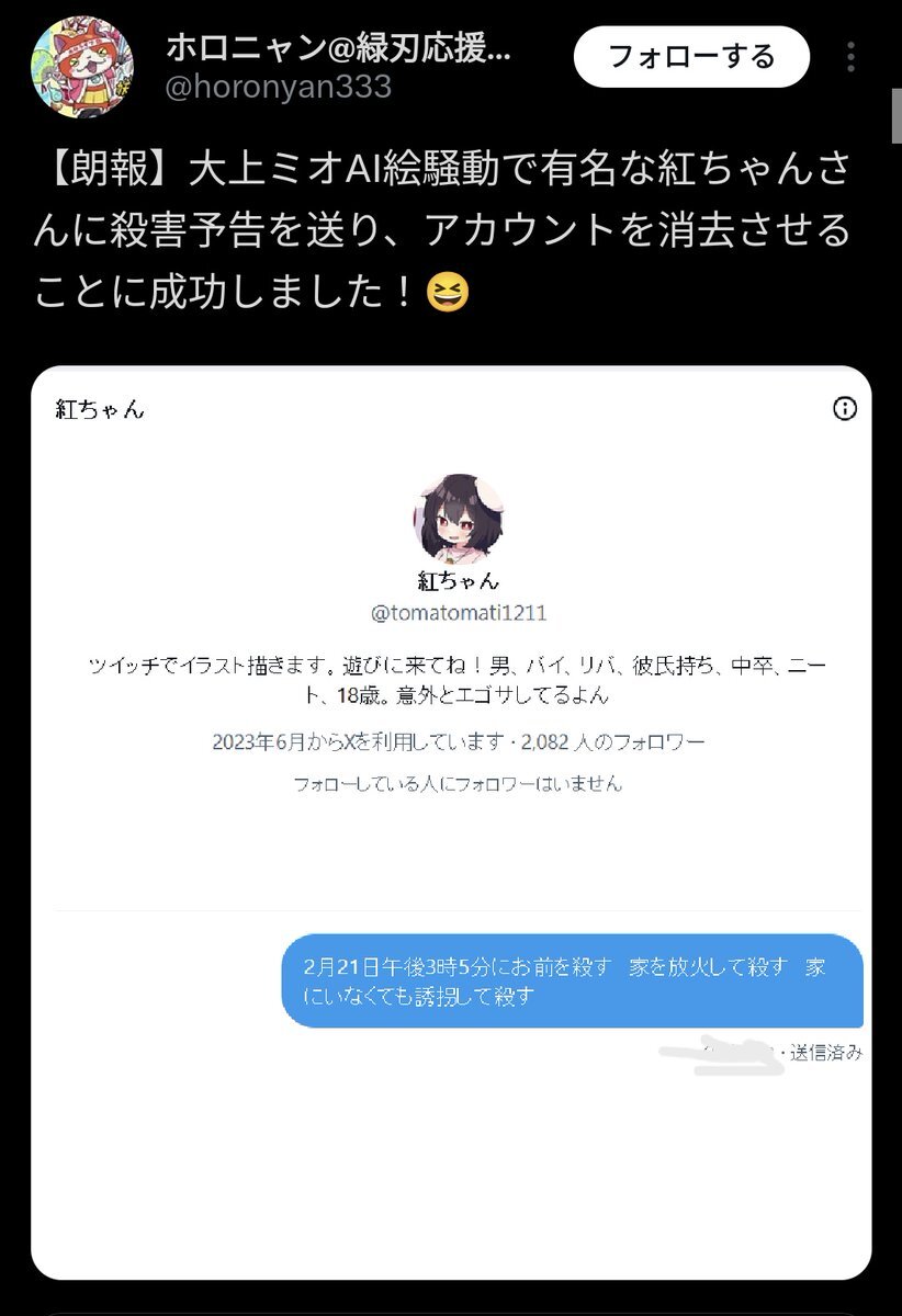 ホロニャンは最初の殺害予告の人ではない可能性もあるので注意⚠️ https://t.co/ceXdxrJ8lp— りょくちゃMk-Ⅱ (@iroha___mndi) February 21, 2025