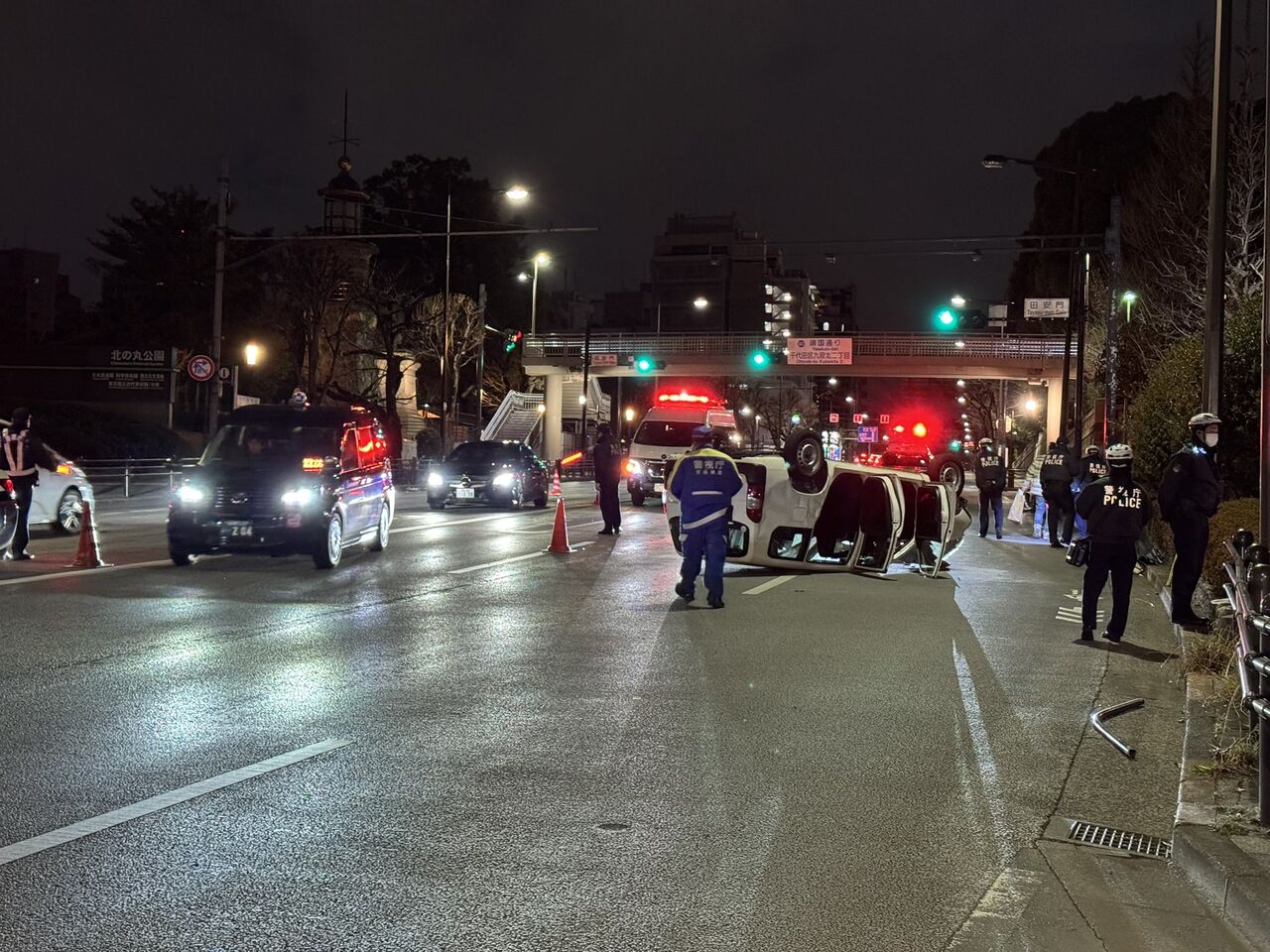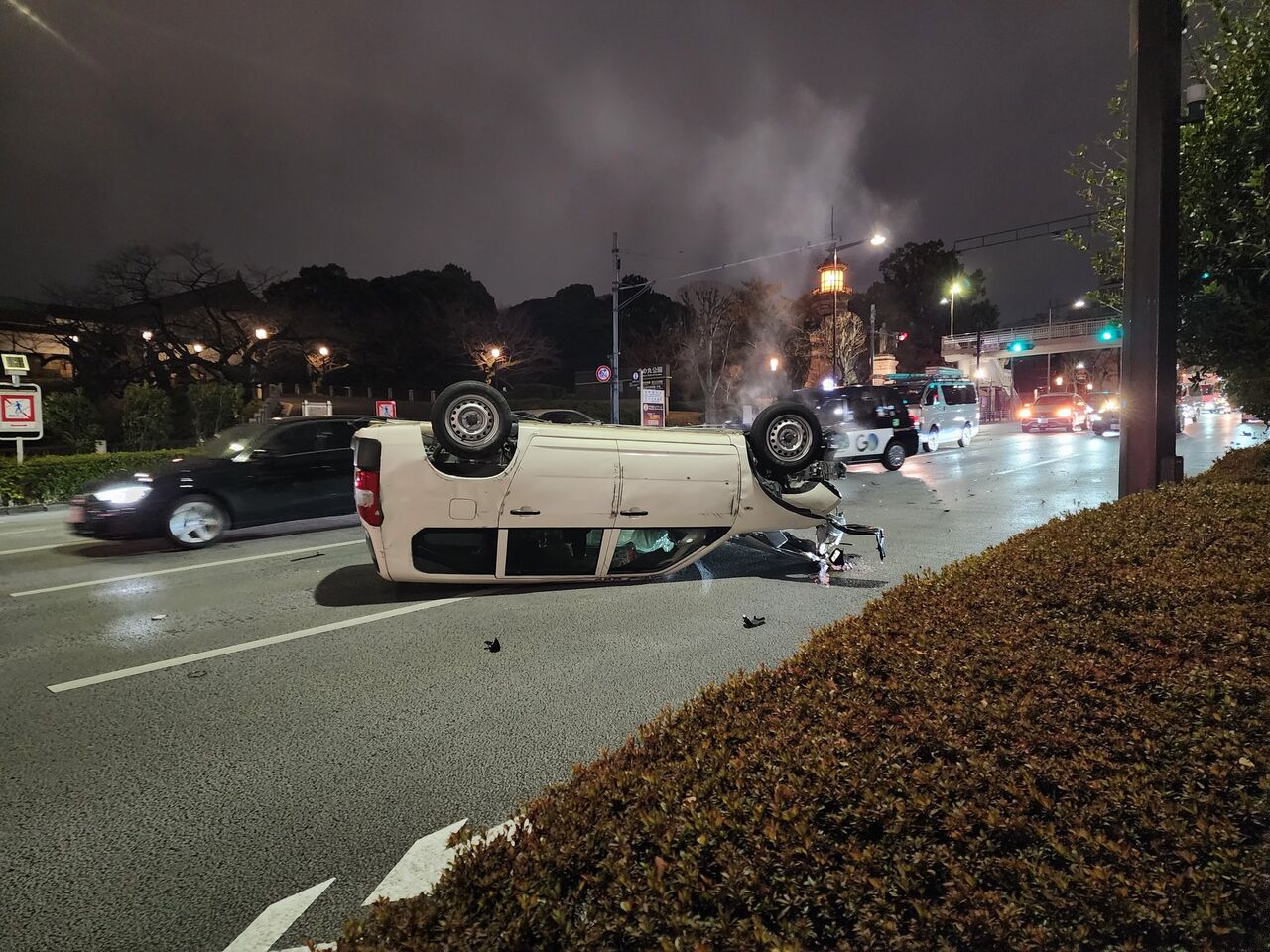 『九段下、武道館前でグシャグシャの車引っくり返ってた💥』