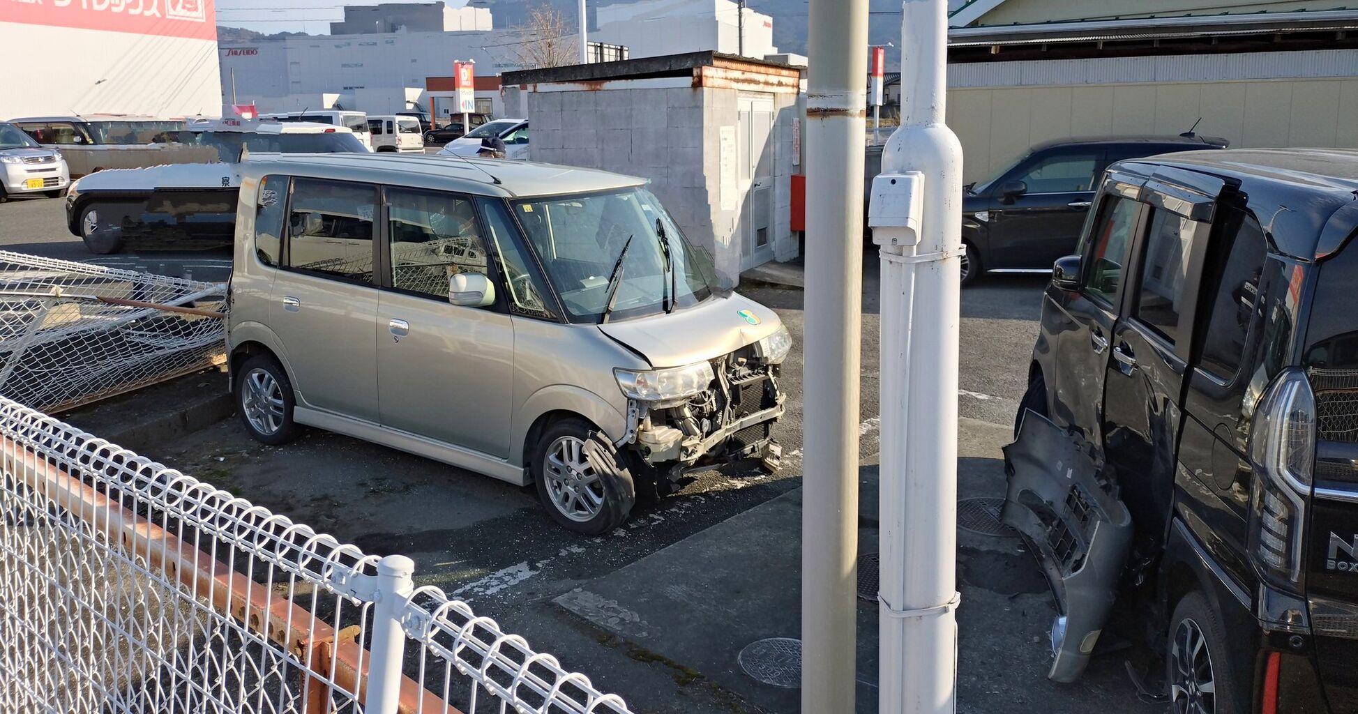 事故の瞬間は目撃してないけど駐車場で数台の車と衝突した後さらに、車輪止めとフェンスを飛び越えて、隣の駐車場の車にぶつけて大破したっぽい状況