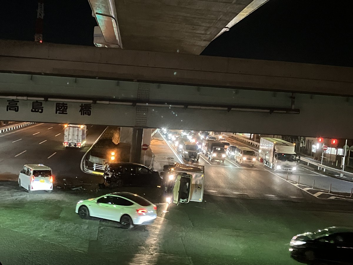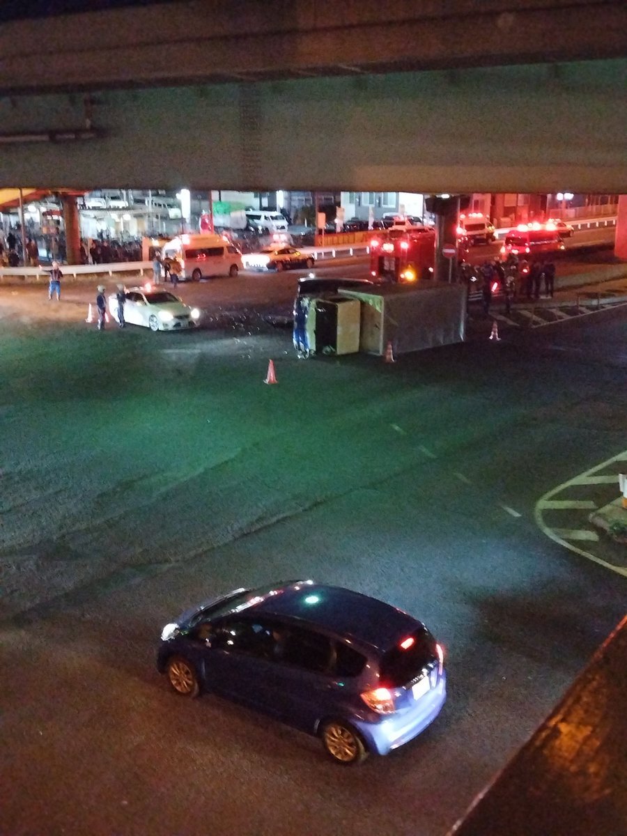 凄い音がするなあ・・・と思って振り返ったらトラックの横転事故でした。高島平交差点。ガラケーで110番しつつ片手にスマホでごめんなさい・・・(汗) pic.twitter.com/l4creDeUKN