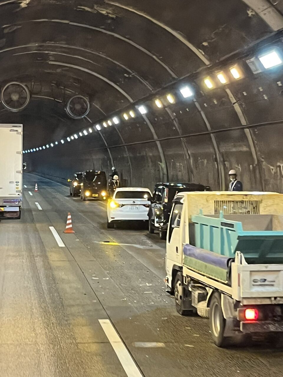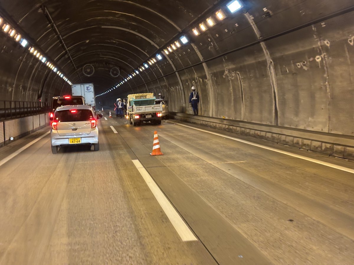 山陽道上り広島IC手前のトンネルで玉突き事故。お気をつけて。