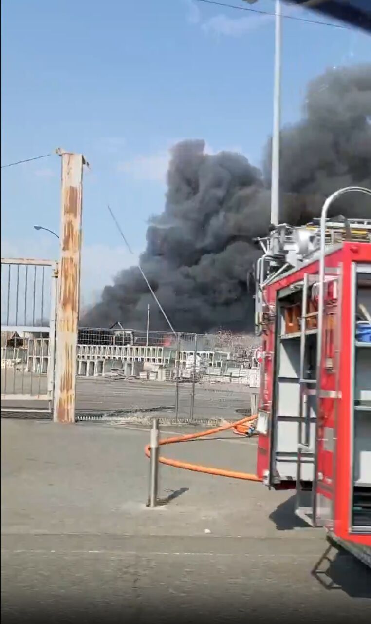 ヤード資材置き場付近から黒煙あがる火災。