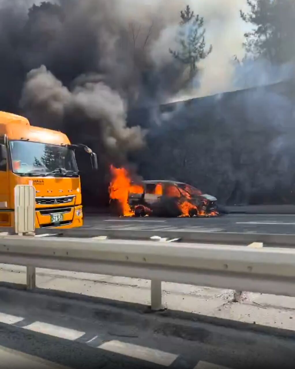 山陽道下り福石PA直前で車燃えとる