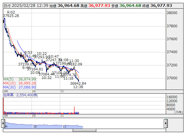 日経平均株価の下げ幅が1300円を超えた。12時39分現在、1313.33円安の3万6942.84円まで下落している。