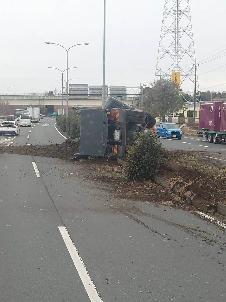 『新4号上三川インター付近でトラックが横転しています』