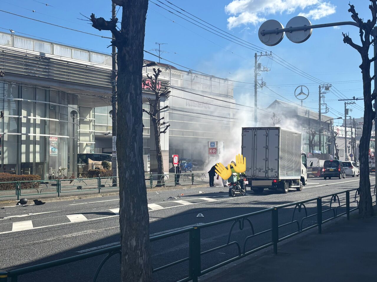 【現場の様子】#交通情報 新青梅街道 上り 東京都東久留米市前沢5丁目付近 煙あがるバイクとトラック衝突事故で一時交通規制渋滞3月7日 #東久留米 #小平 #火災
