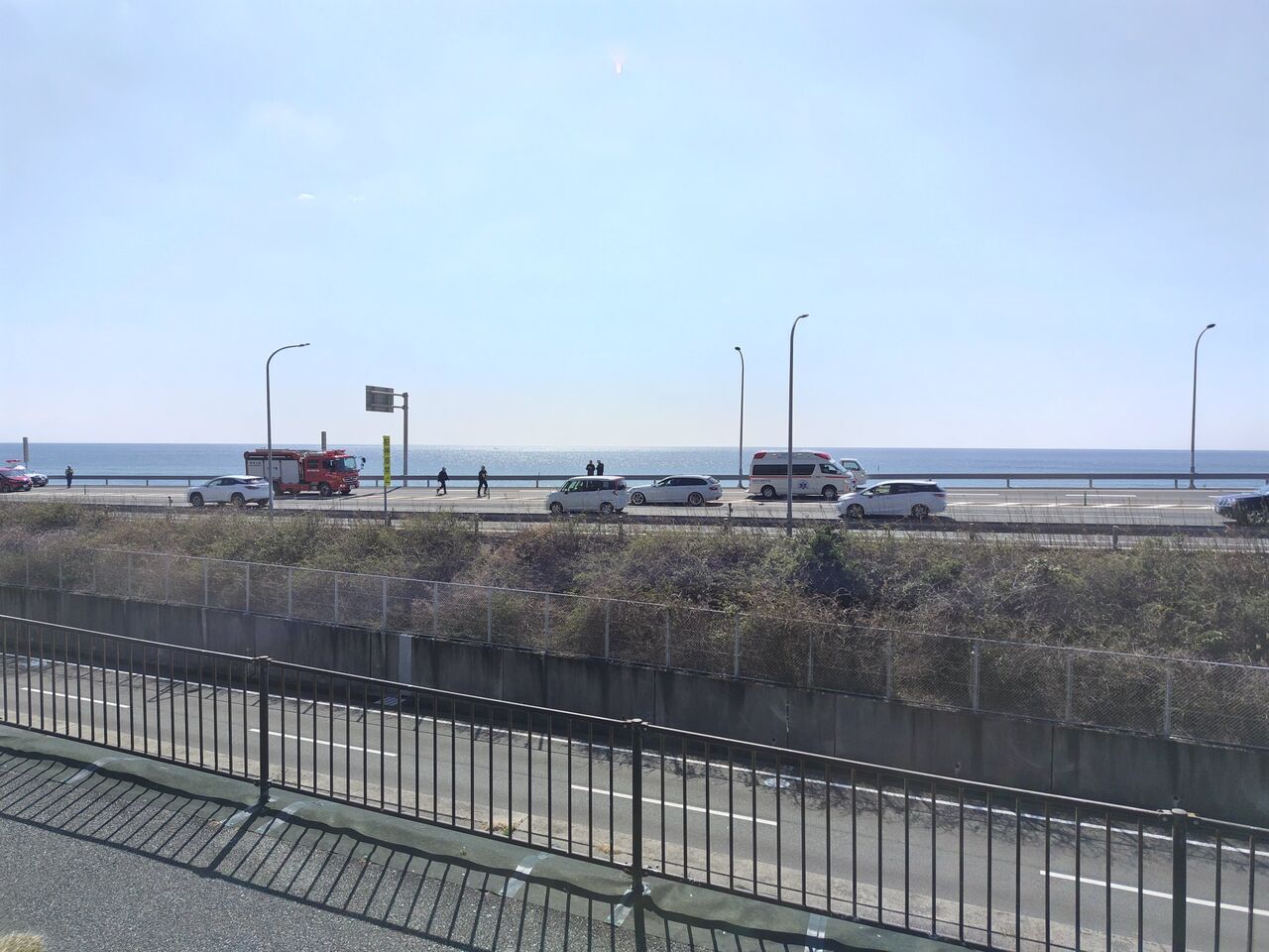 【現場の状況】#交通情報 #国道1号 浜名バイパス 下り 静岡県湖西市白須賀 道の駅潮見坂付近 人身事故で通行止め渋滞3月8日 #渋滞 #静岡 #湖西 #浜松