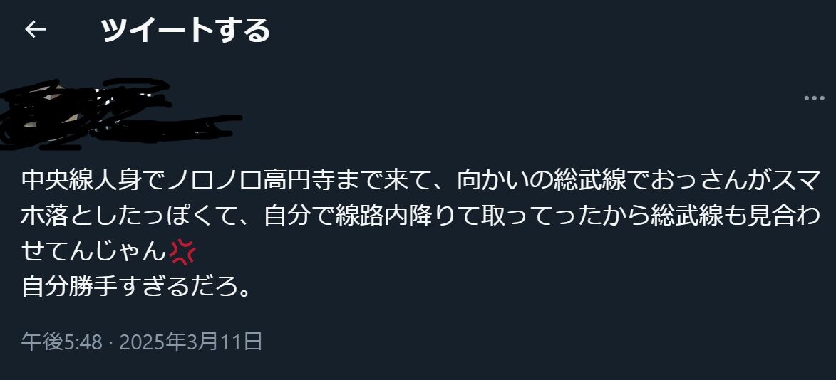 『中央線人身でノロノロ高円寺まで来て、向かいの総武線でおっさんがスマホ落としたっぽくて、自分で線路内降りて取ってったから総武線も見合わせてんじゃん💢 自分勝手すぎるだろ。』