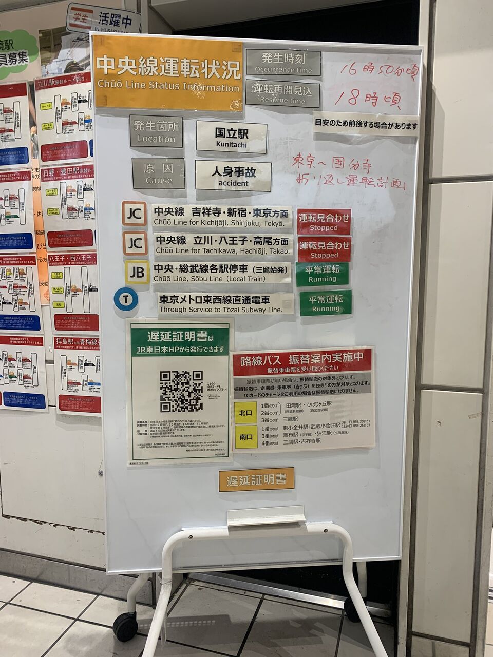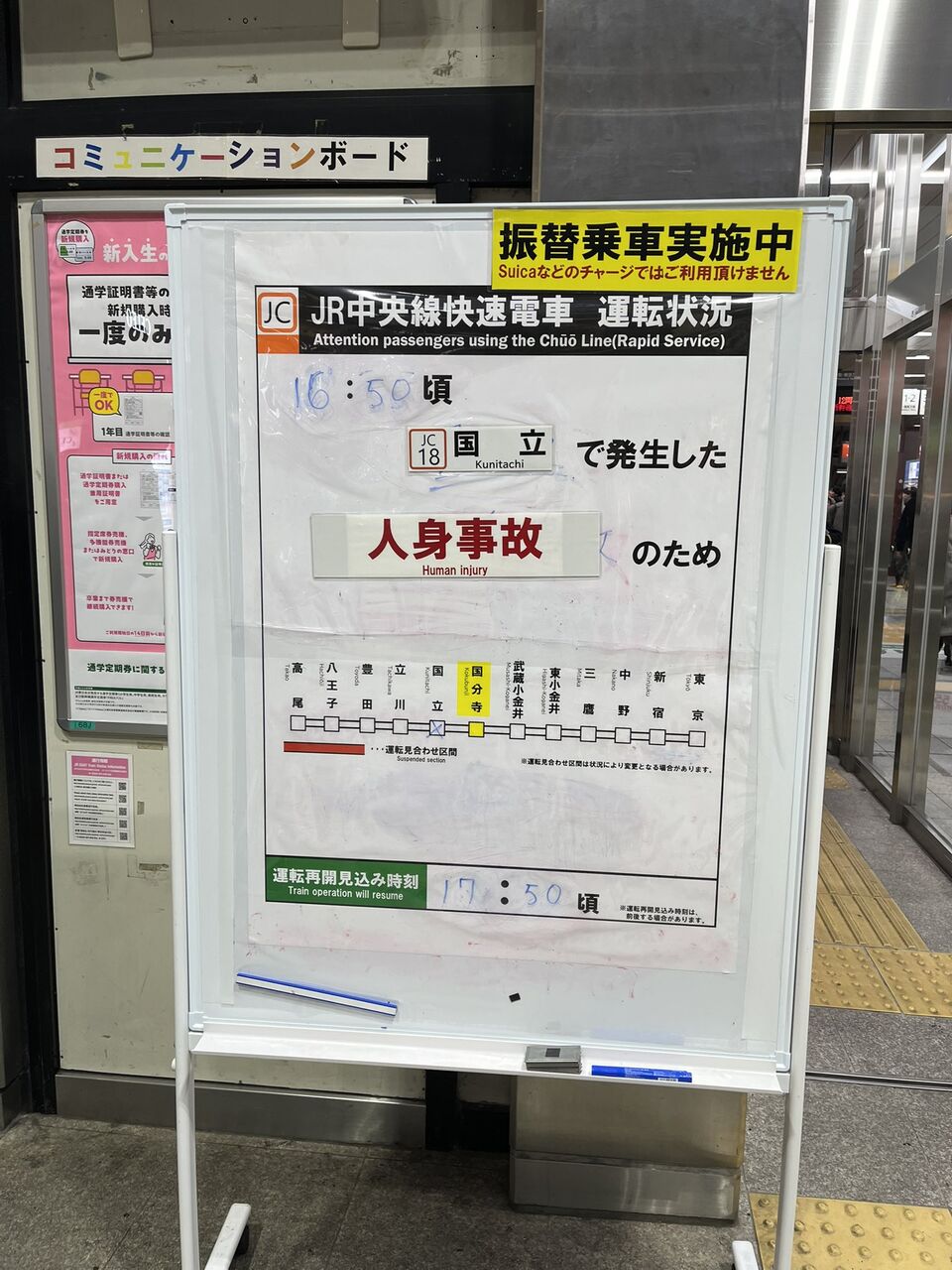 中央線快速電車は、国立駅での人身事故の影響で、上下線で運転を見合わせています。