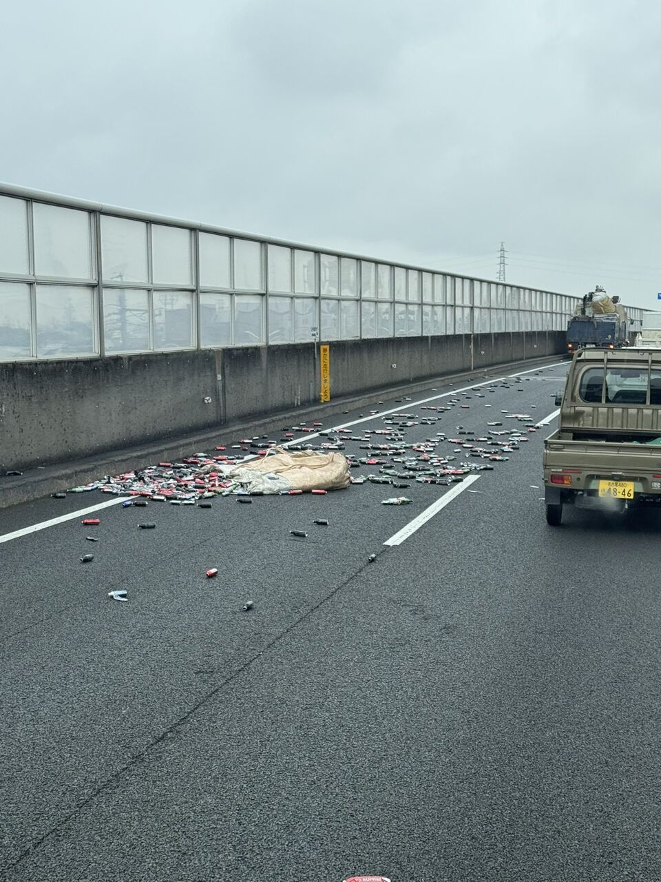 トラック積荷のビンカンが散乱している模様