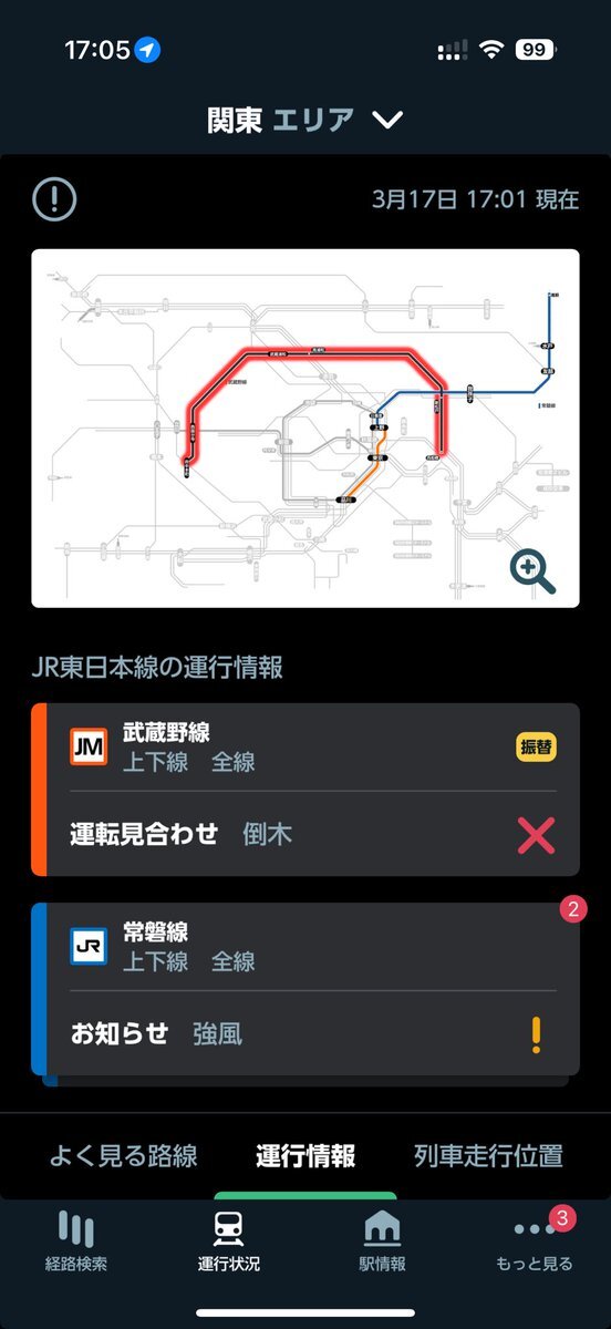 武蔵野線は、西船橋〜船橋法典駅間での倒木の影響で、上下線で運転を見合わせています。運転再開は17時30分頃を見込んでいます。 #武蔵野線 #Musashino_Line https://t.co/dJGOmYnTuK— JR東日本【総武方面】運行情報 (公式) (@JRE_F_Sobu) March 17, 2025