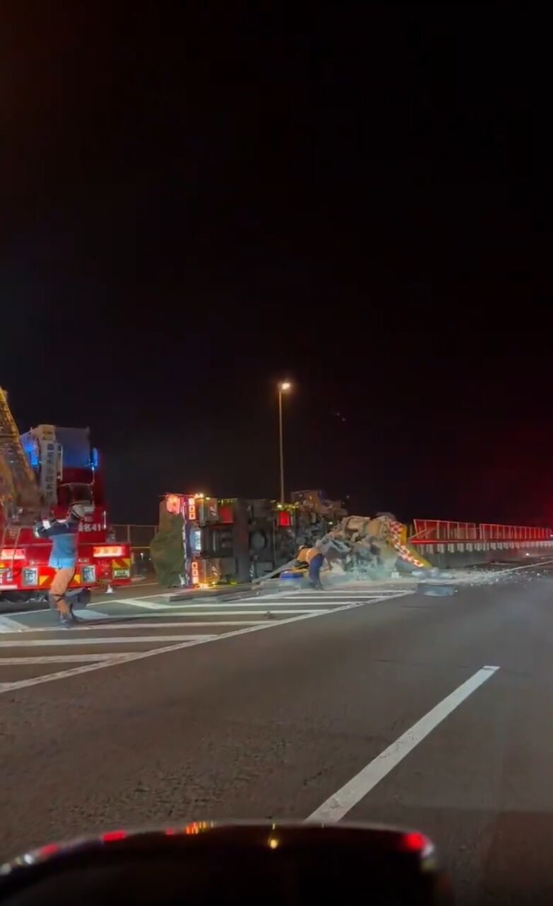 みえ川越出口にトラックひっくり返って本線に荷物ばらまいてます。 pic.twitter.com/ebb3mEuplT