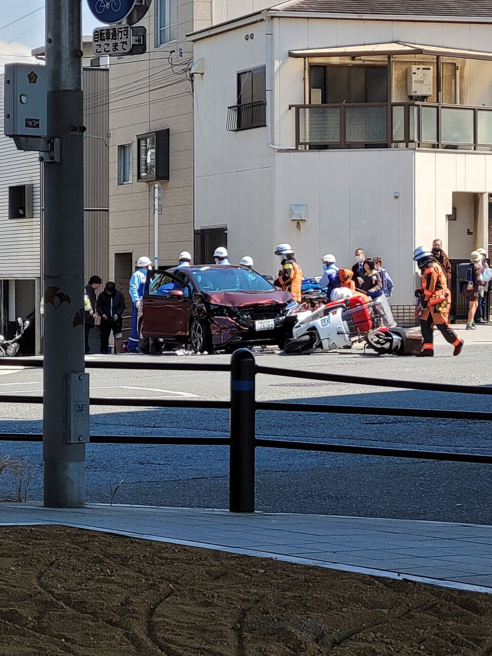 【現場の様子】#交通情報 此花区484号線 大阪市此花区伝法4丁目 阪神なんば線 伝法駅付近 バイクと乗用車衝突事故3月18日 #大阪 #伝法