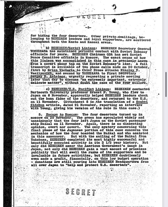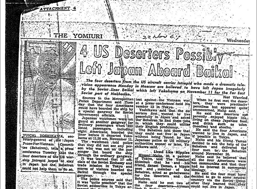 「ソ連大使館の電話回線の秘密盗聴から関係が分かっている。(中略)ベ平連の吉川事務局長からセルゲイ・アニシモフ第一書記官にかけられた。吉川は非常に重要で繊細な問題について、その日中に緊急非公開会合を開くよう要請した。その議題は4人の米脱走兵の問題だったに違いない」