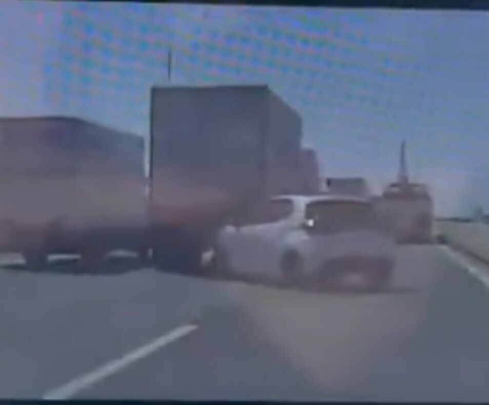 中央車線でトラック乗用車3台玉突き事故の模様
