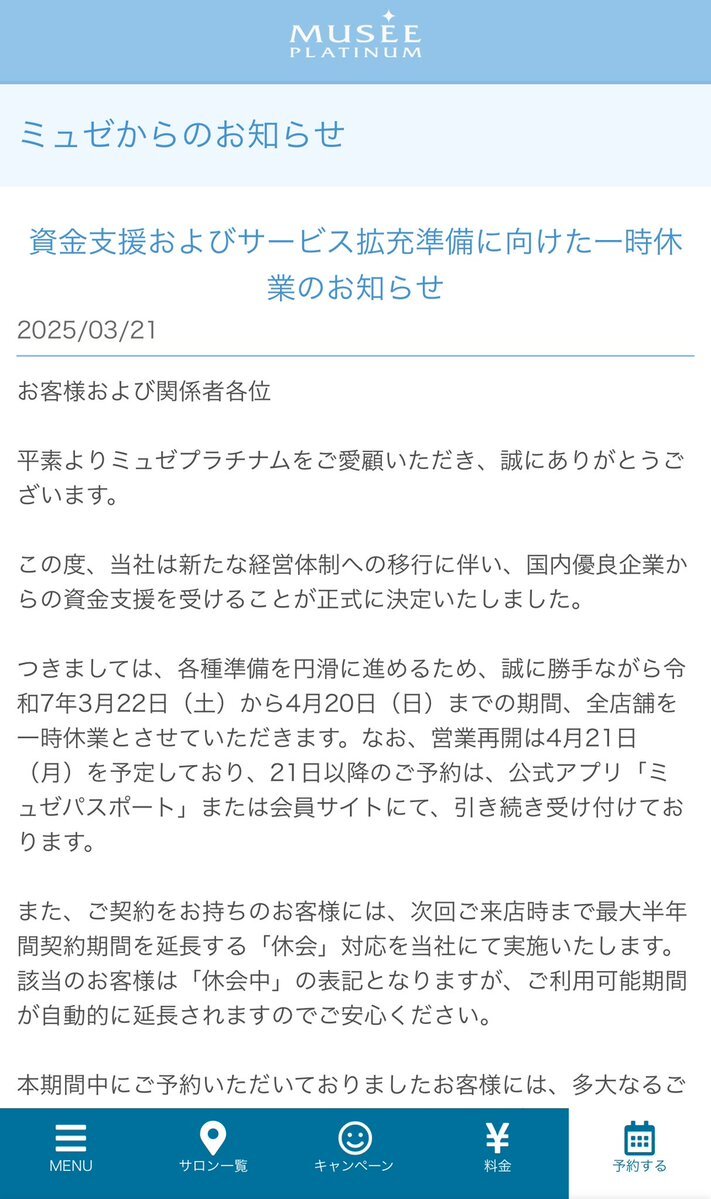 ミュゼ、店舗閉店したから2月の予約を4月に変更したら明日から一時休業は無理すぎる……まじで、、勘弁して、、、、— ゆゆゆ@修行中 (@0yu_yu_yuri0) March 21, 2025