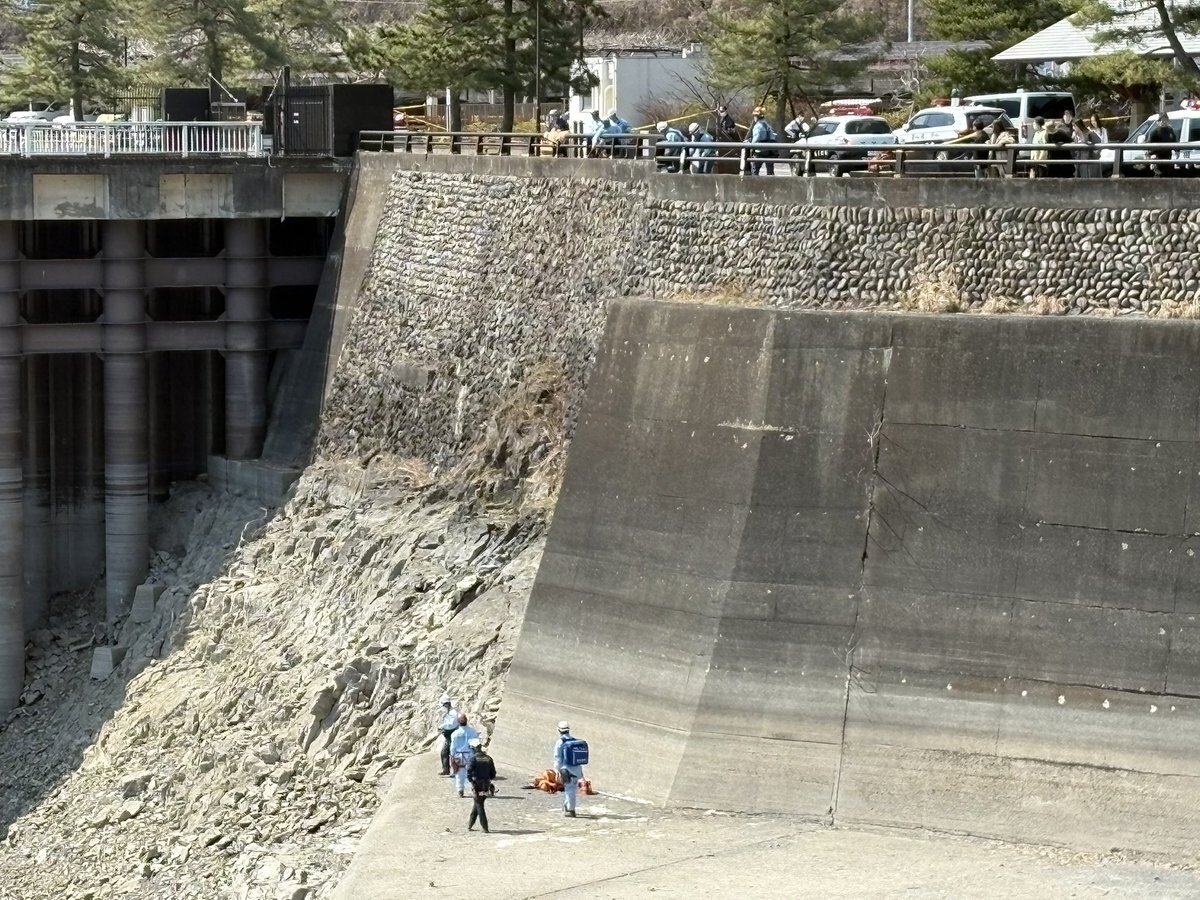 ダムの側に沢山のお巡りさんと、潜水士、、、