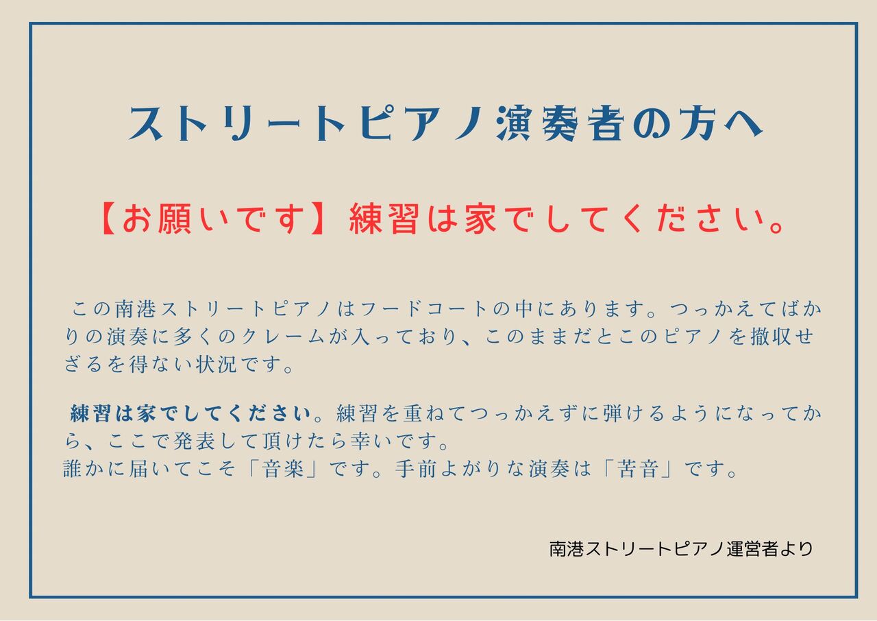 言葉選びって難しいですね…言葉遣いって難しいですね…よしださんみたいな方がいて素敵な演奏を聞く機会が増え私はストリートピアノって本当に素晴らしい文化が根付いて来たと感謝していました。公共の無料がサービスなら誰に向けても開くべきでは?事情はわかりますが、とても残念な張り紙です。