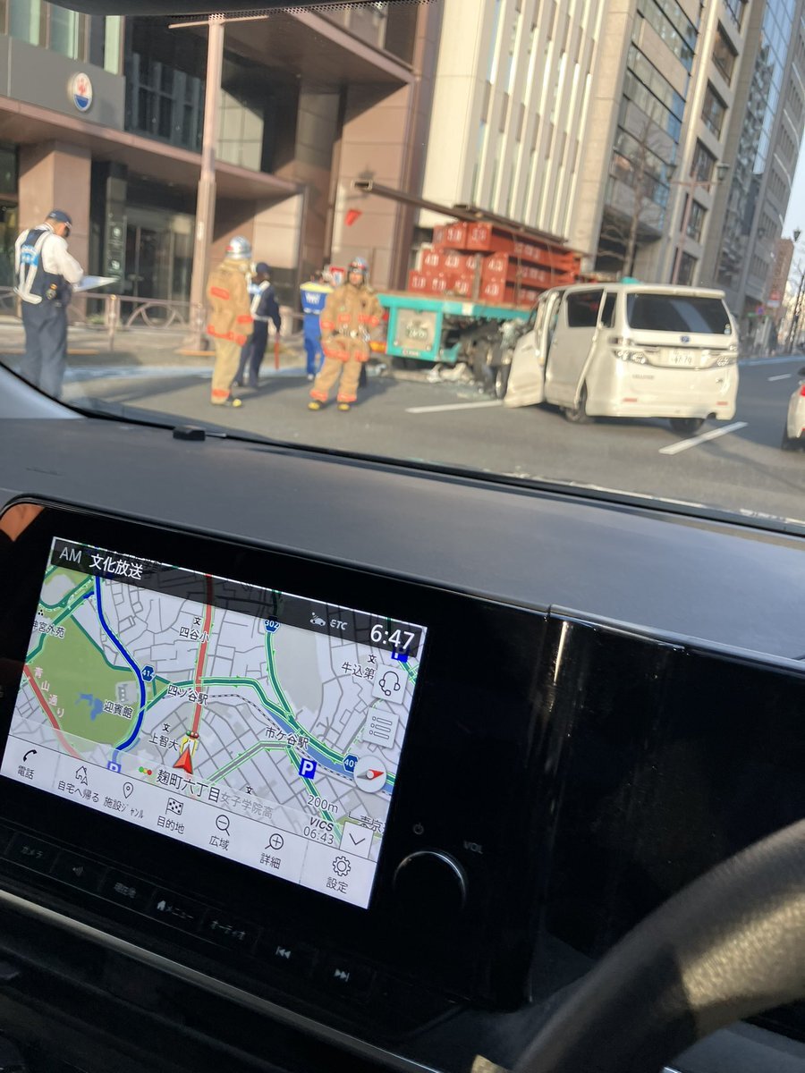 甲州街道、四ツ谷駅過ぎて麹町6丁目の交差点の先でミニバン大破してた pic.twitter.com/1OI5J4a67C