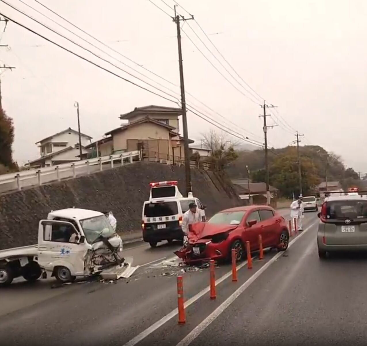 軽トラと乗用車が正面衝突事故でフロント大破している模様