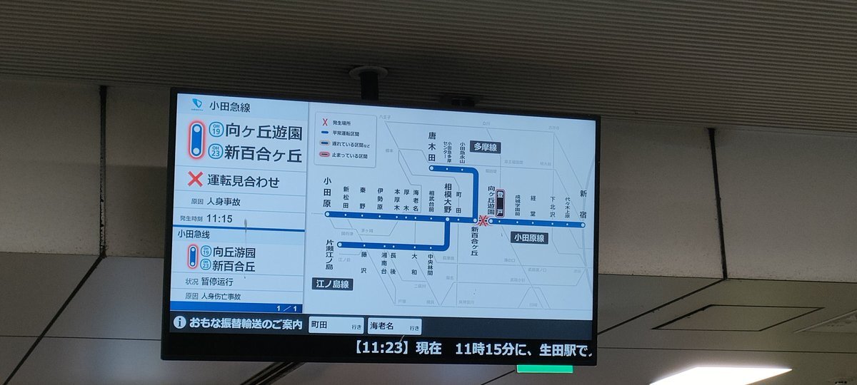 03月28日11時33分現在【直通運転中止】11時15分頃、小田急小田原線 生田駅で人身事故のため、小田急小田原線との直通運転を中止しています。 https://t.co/kks2eRmIJL