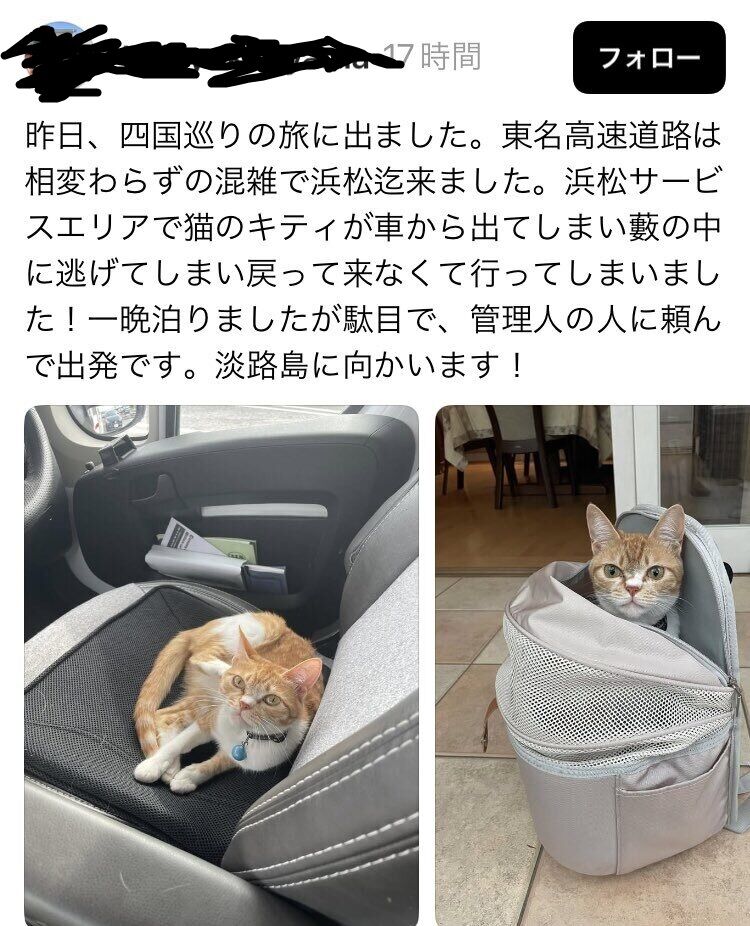 『旅行に猫連れ回してSAで逃したあげく自分は旅行続けるありえない投稿あったんだけど⁉️』