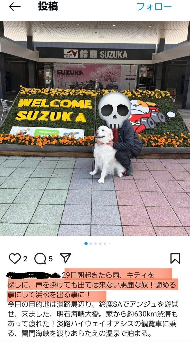 飼い主は一晩探したが見つからず管理人に声掛けして四国旅行へ続行