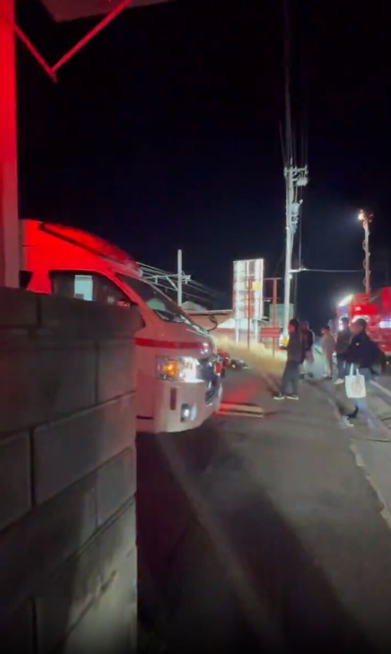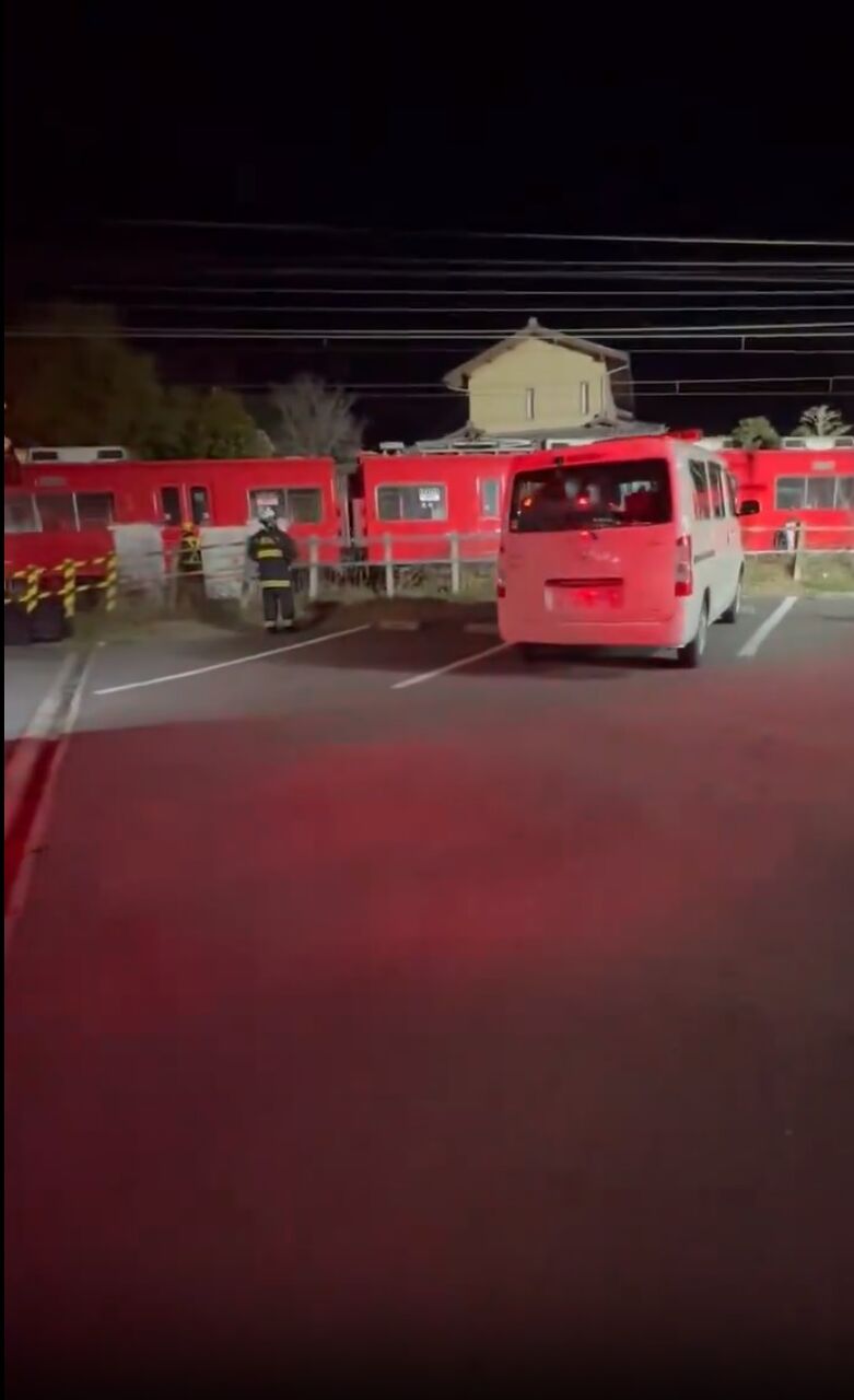 『なんかすごい消防車やらパトカーやらの音で、え?今日また火事?まさか知人の家では…と外を見たら、家からチラ見えする八幡新田駅の普段電車止まらないあたりに、赤い電車が照らされて止まってら…