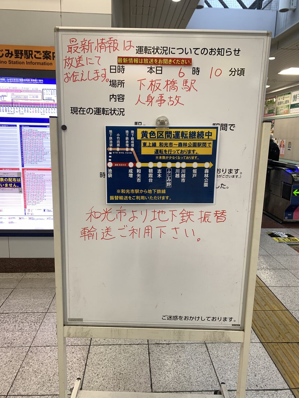 おいふざけんなよ6時ちょいの電車が全然来ないと思ったら下板(池袋)辺りで人身事故だよ、これだから東武は…