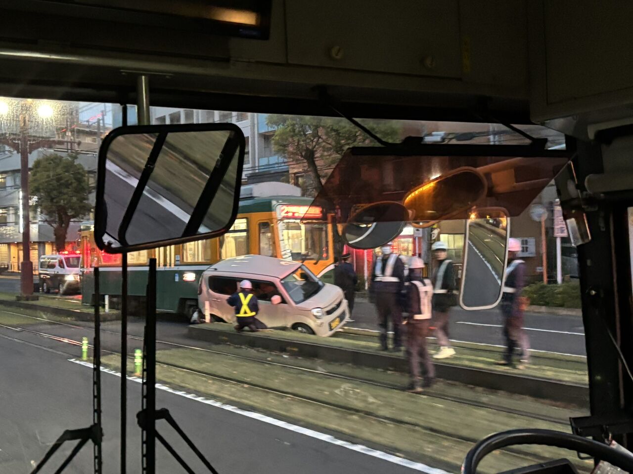 市電と中央分離帯の間に車が挟まれてる模様