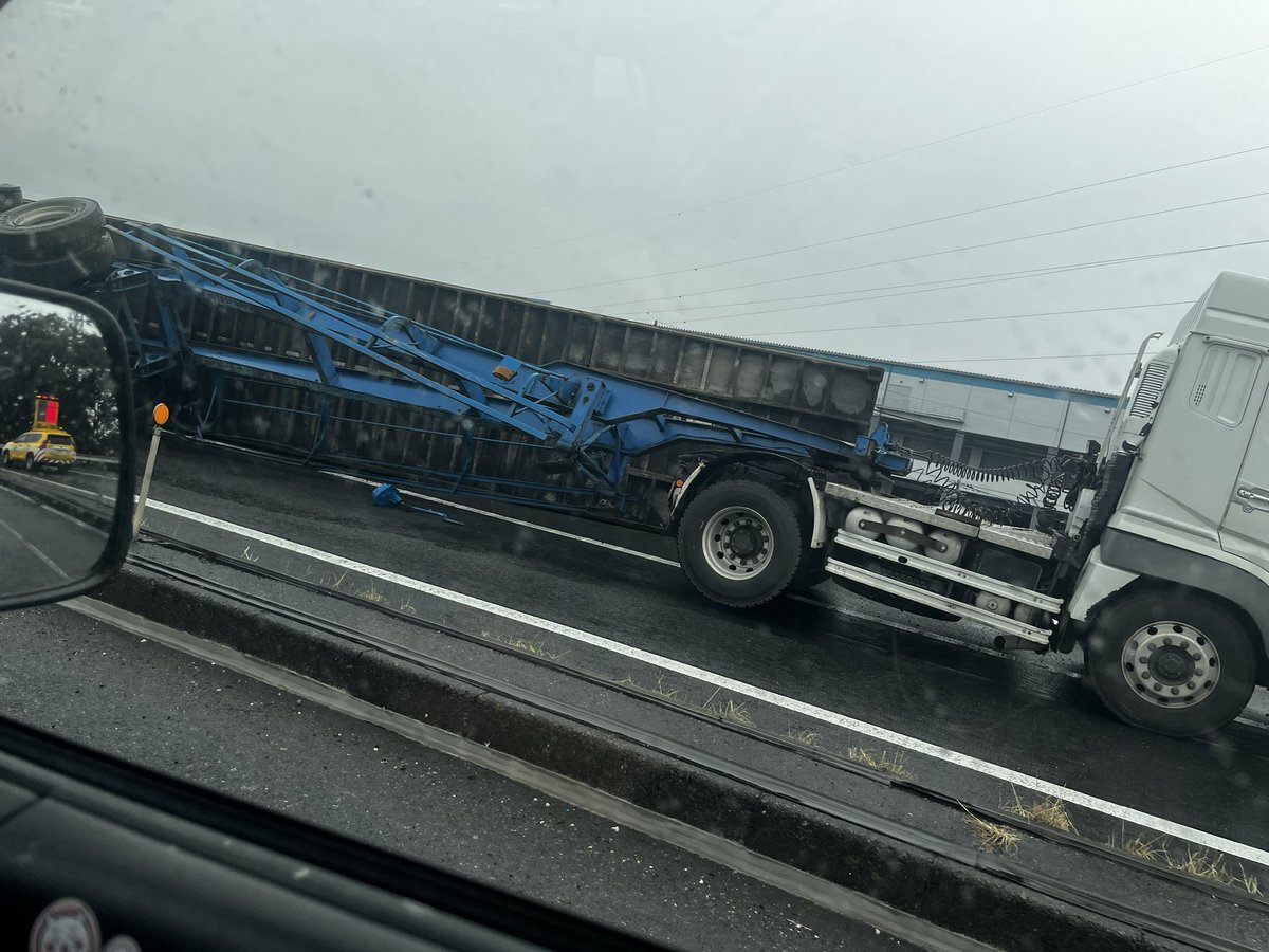常磐道柏インター出口でトレーラーがひっくり返って大渋滞が始まってる😱 pic.twitter.com/xYeZcQAwJd