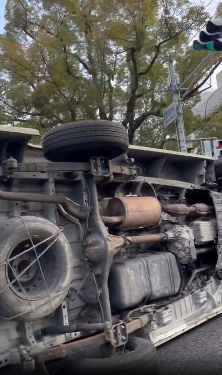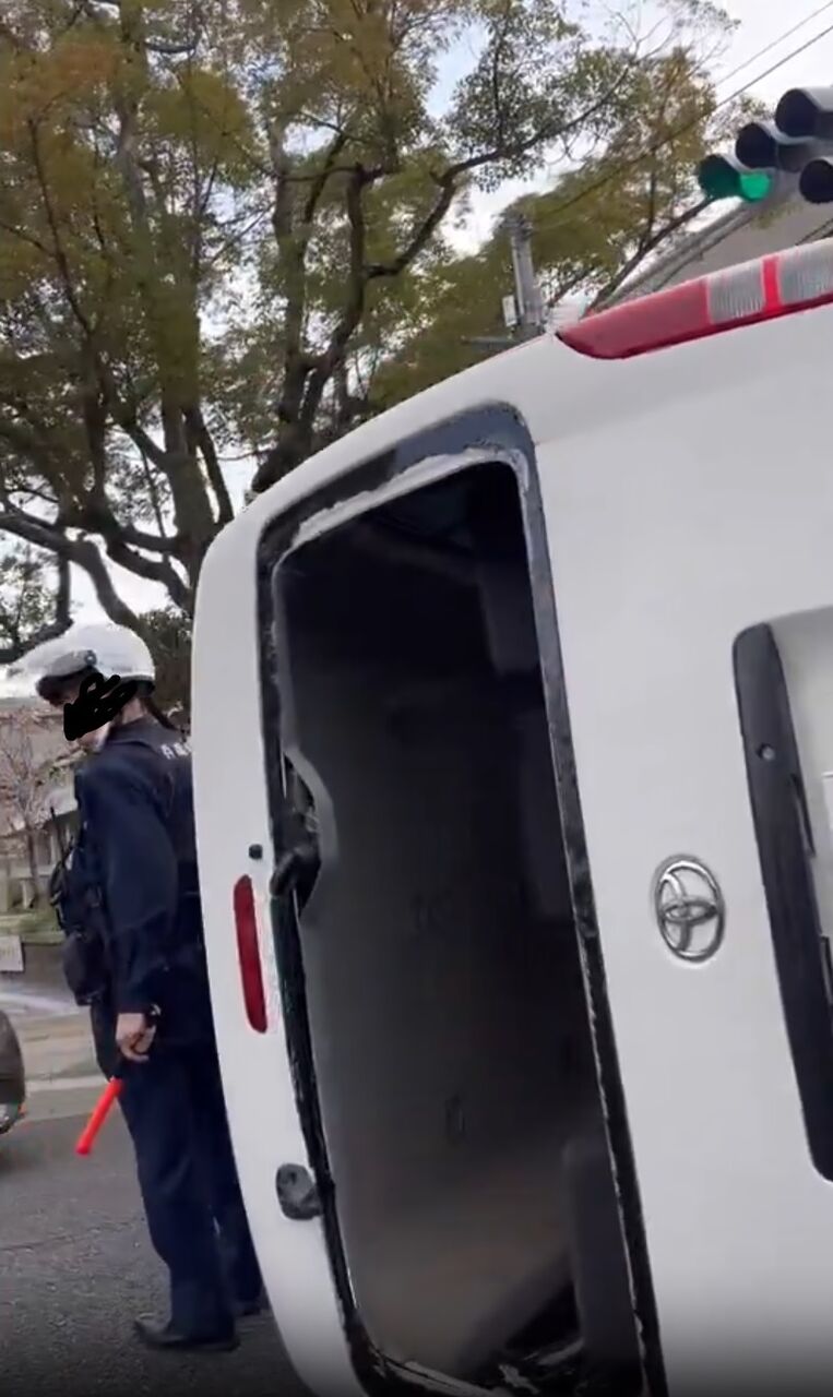 『市役所筋前線と2号線の交差点でワンボックス横転事故』