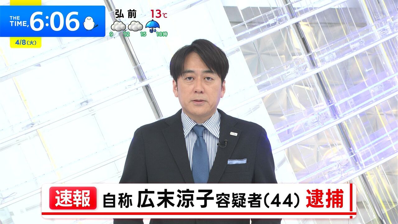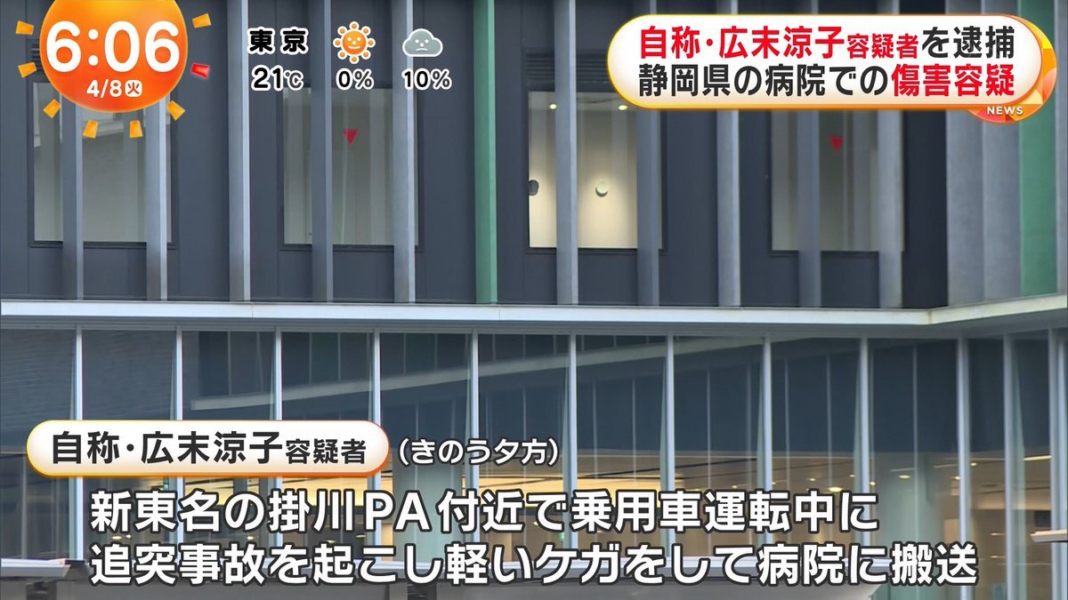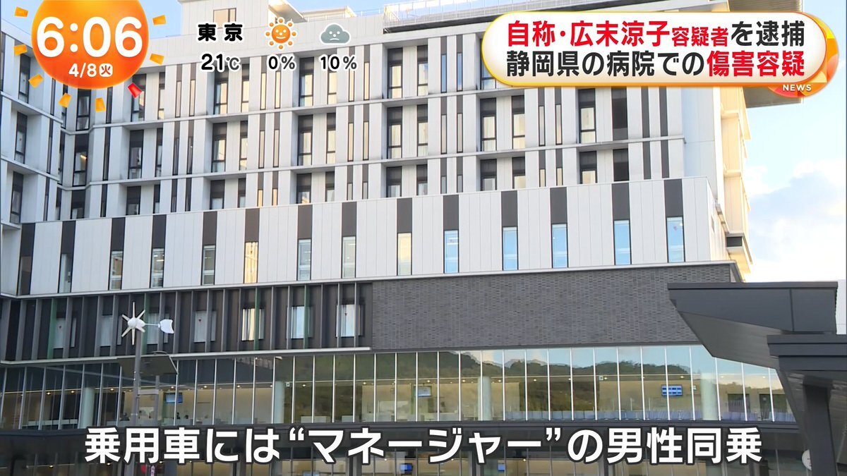 逮捕されたのは自称・俳優の広末涼子容疑者(44)で、警察によりますと8日午前0時20分頃、静岡県島田市の病院で看護師の女性を足蹴りしたり腕をひっかいたりする暴行を加え軽いケガをさせた疑いが持たれています。