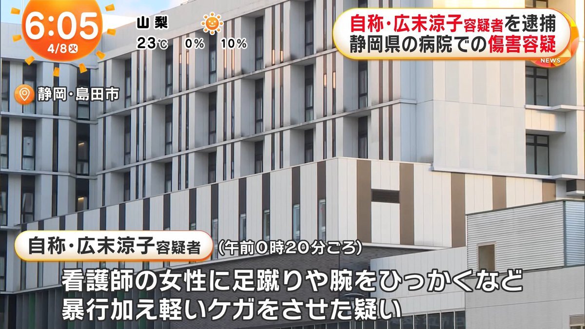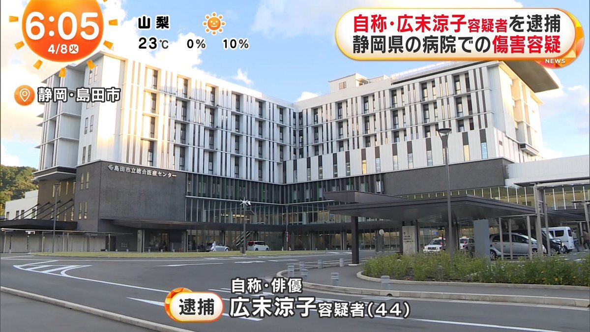 静岡県島田市の病院で看護師をひっかくなど暴行を加え軽いケガをさせたとして傷害の現行犯で女が逮捕されました。女は俳優の広末涼子だと名乗っているということです。