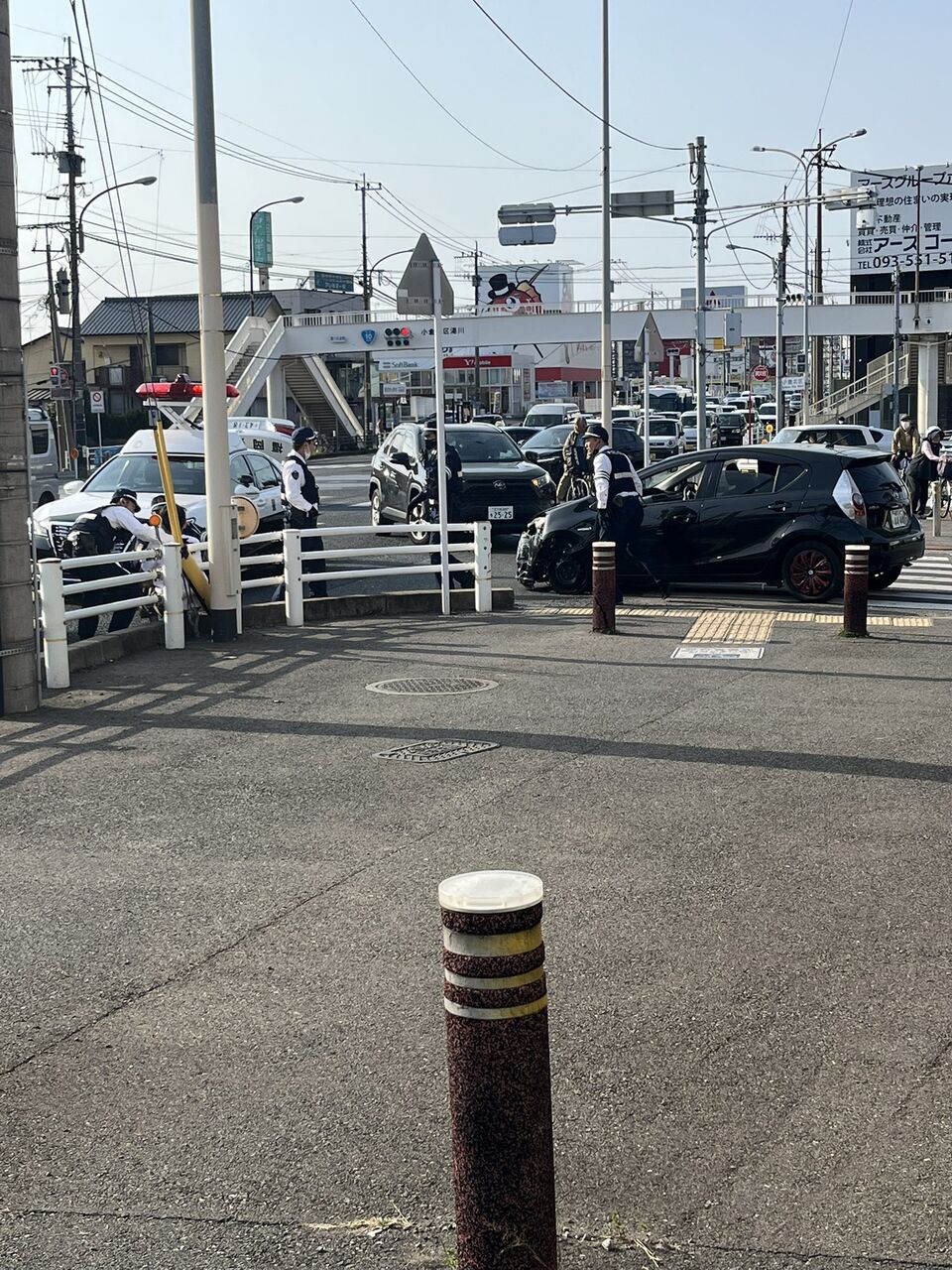 【現場の様子】#交通情報 福岡県北九州市小倉南区湯川交差点付近 タイヤ消失した乗用車にパトカー複数台出動集結 逃走車か 周辺道路一部交通規制4月8日 #福岡 #北九州 #小倉