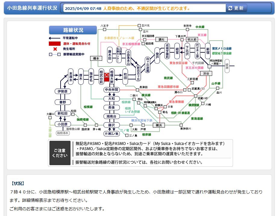 2025年04月09日07時45分 人身事故のため、不通区間が生じております。 https://t.co/XiXxvjOFTj