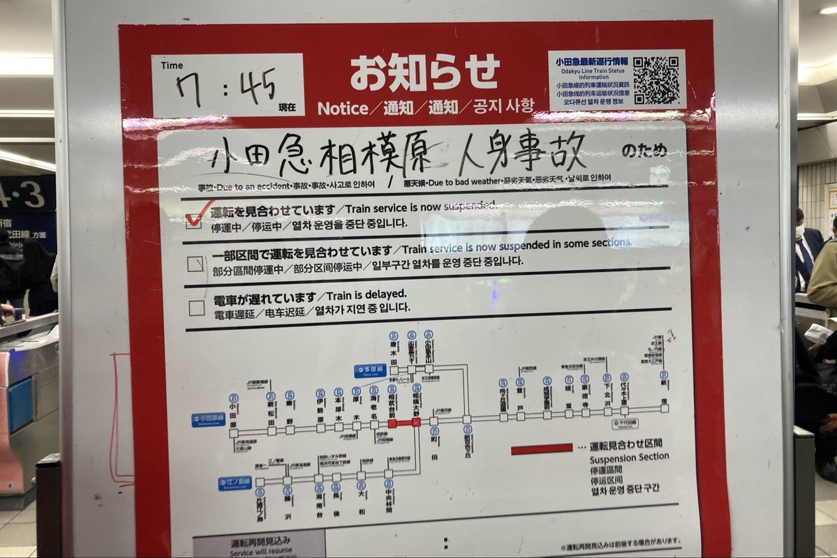 【小田急小田原線】07:40頃、小田急相模原〜相武台前駅間で発生した人身事故の影響で、運転を見合わせててぴえん🥺 振替輸送を行ってる pic.twitter.com/p6eVvQ63Ih