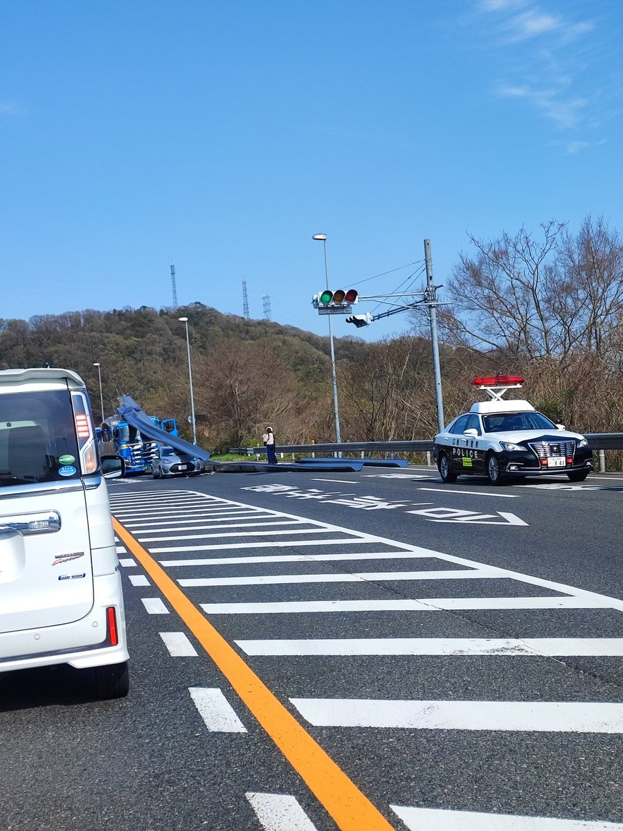 【現場の様子】#交通情報 #国道2号 三原バイパス 広島県三原市新倉町ランプ付近 大型トラックの積荷が落下 乗用車に接触事故で上下線規制渋滞4月9日 #広島 #三原