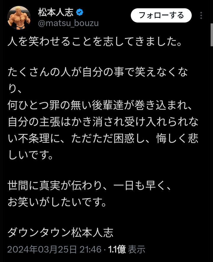 【悲報】松本人志「人を笑わせることを志して来ました」←何も言い返せんかったわ… 2025/4/11 速報 1: document.write(” + ”); 関連記事 【速報】4月の松本人志さんの動き 【文春】松本人志の裁判で登場した謎の大物タレントさん、答え合わせ。 【速報】“文春”を訴えた松本人志さん、こうなる 【画像】松本人志が抜けたM-1審査員、こうなる 【地獄】松本人志「裁判取り下げます。記者会見しません。後輩芸人が路頭に迷いました」 → その結果wwwwwwww document.write(” + ”); 続きを読む ——— Source: アルファルファモザイク 【悲報】松本人志「人を笑わせることを志して来ました」←何も言い返せんかったわ…
