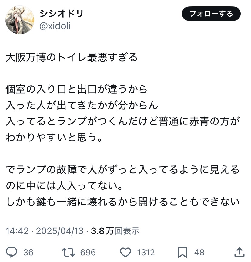 【💩地獄絵図】大阪万博、とんでもない事になってたwwwwwwwwwwwwwwwwwwww 2025/4/13 速報 1: https://imgur.com/xmp6G24.jpeg document.write(” + ”); 関連記事 【悲報】れいわ新選組さん、大阪万博中止デモをしてしまうw 【朗報】大阪万博、激混みするwwwww 【速報】大阪万博の開会式、五輪を軽く上回ってしまうwww 【悲報】高校生「修学旅行で大阪万博に行きたくないです。怖いです。」 【悲報】大阪万博、とんでもない“真実”が明らかになる document.write(” + ”); 続きを読む ——— Source: アルファルファモザイク 【💩地獄絵図】大阪万博、とんでもない事になってたwwwwwwwwwwwwwwwwwwww