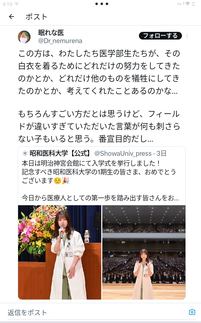 【悲報】女子医学生さん、橋本環奈にぶち切れwwwwwwwwwwwwwwwwwwwwwwwwwwwww 2025/4/16 速報 1: この方は、わたしたち医学部生たちが、その白衣を着るためにどれだけの努力をしてきたのかとか、どれだけ他のものを犠牲にしてきたのかとか、考えてくれたことあるのかな…もちろんすごい方だとは思うけど、フィールドが違いすぎていただいた言葉が何も刺さらない子もいると思う。番宣目的だし… document.write(” + ”); 関連記事 【画像】橋本環奈さんの足裏、硬そう 【画像】橋本環奈さん、昔からとんでもない上玉と話題に 【画像】橋本環奈さん(26)、まだまだイケる 【悲報】橋本環奈、朝ドラ爆死 『おむすび』 歴代ワースト視聴率・全話平均13・1% 【画像】橋本環奈の初期ビジュ、チートすぎるwww document.write(” + ”); 続きを読む ——— Source: アルファルファモザイク 【悲報】女子医学生さん、橋本環奈にぶち切れwwwwwwwwwwwwwwwwwwwwwwwwwwwww