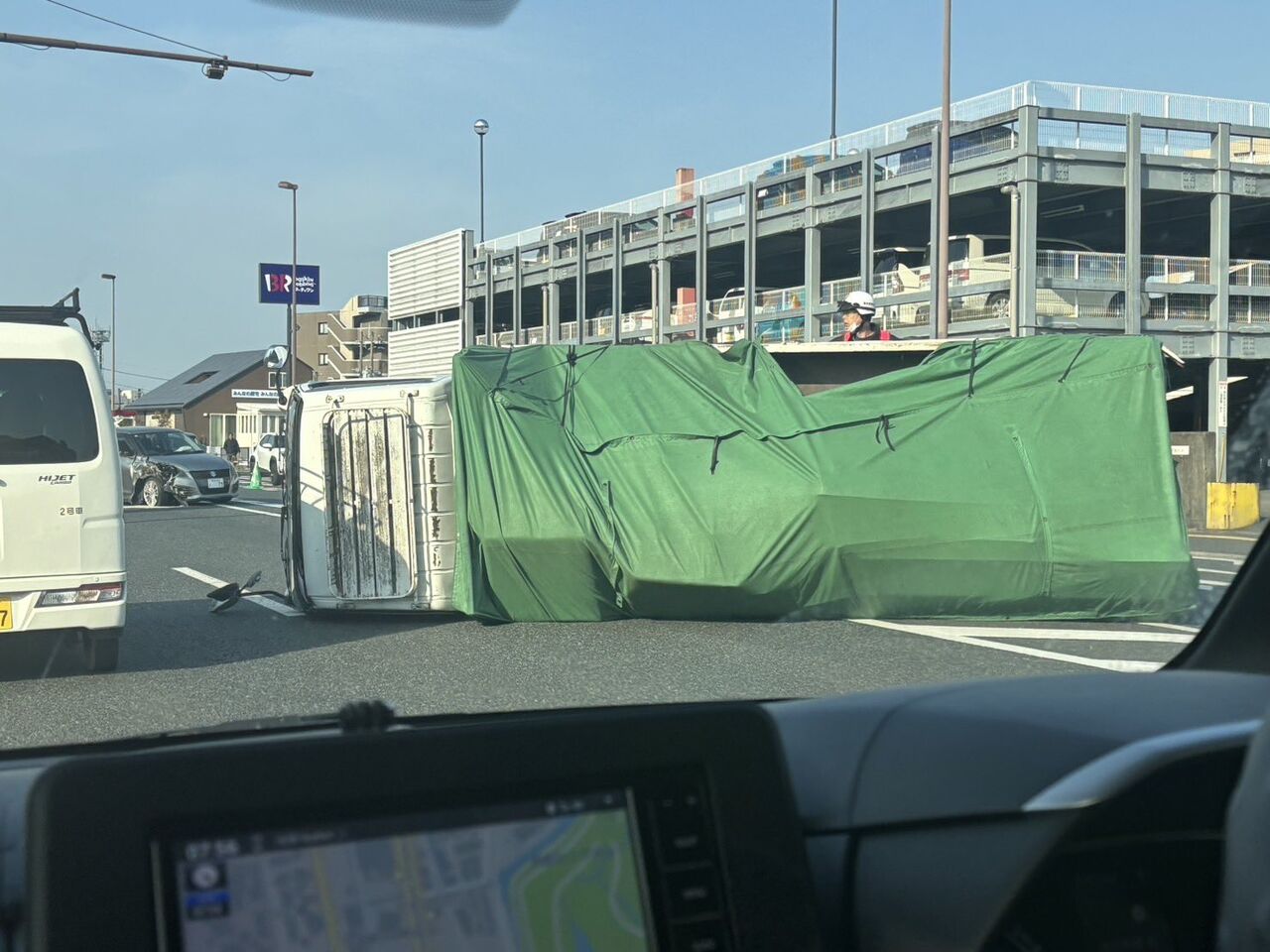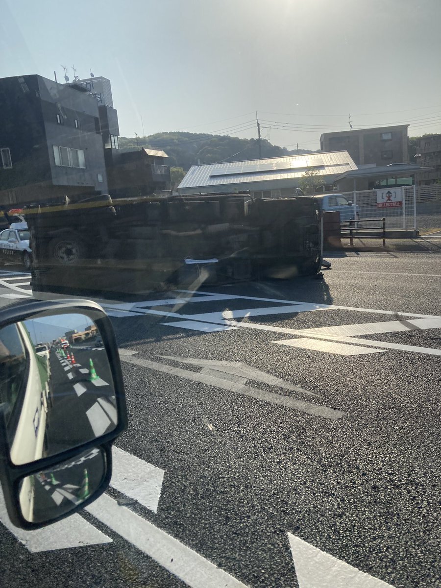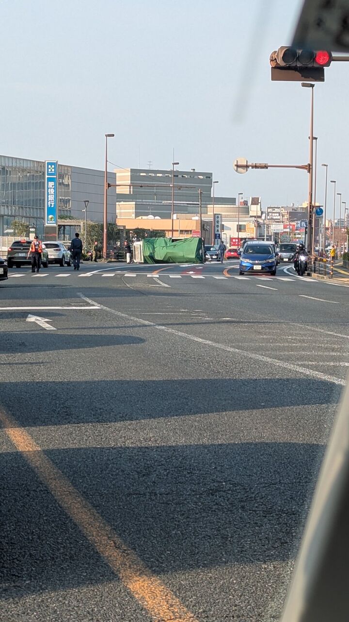 熊本3号線肥後銀行北熊本支店前で事故渋滞。トラックが横転している為長時間渋滞が見込まれます。北部〜市内方面へは迂回が良いかも。 pic.twitter.com/XHdcSYBJ9b