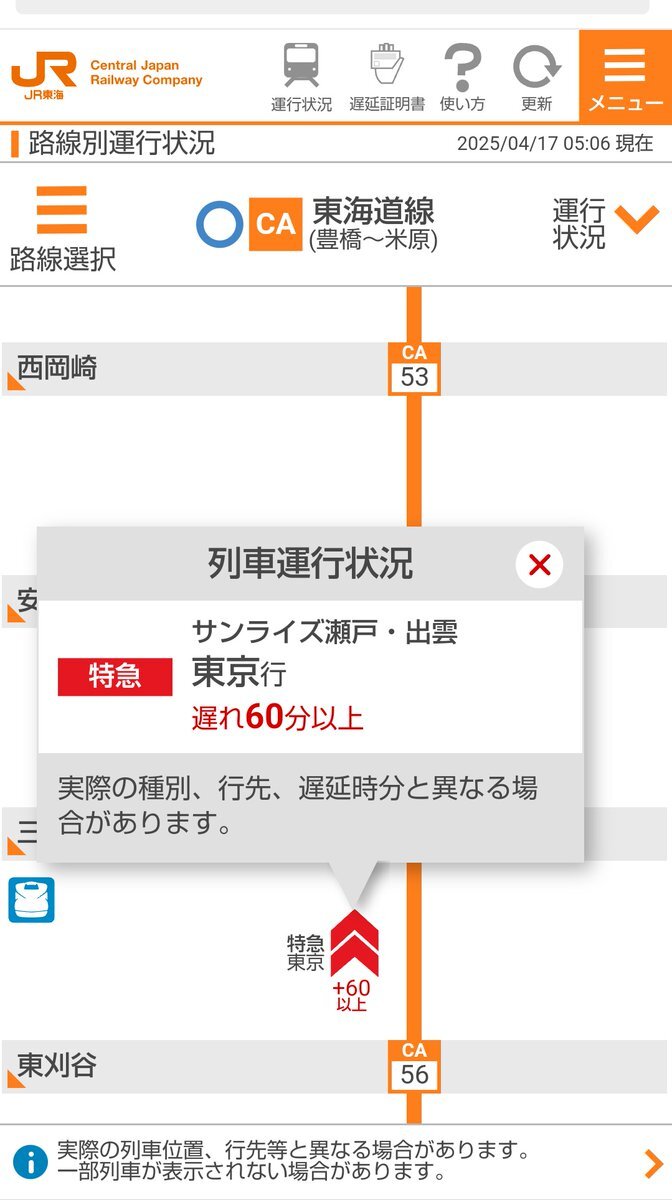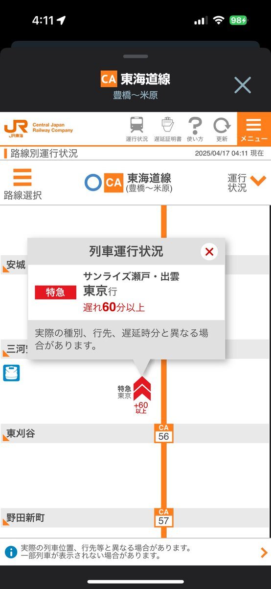 『サンライズ、そろそろ熱海かなと思ったらまだ東刈谷。人身事故疑いとのこと。