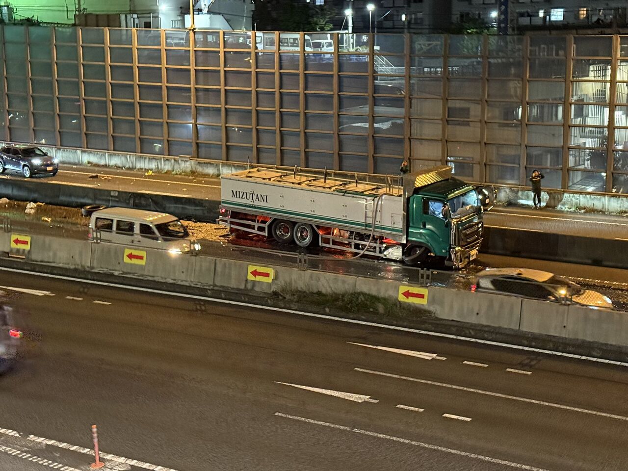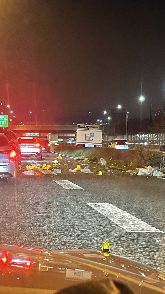 【現場の状況】#交通情報 保土ヶ谷バイパス 上り 新桜ケ丘IC付近 活魚運搬車トラック中央分離帯突っ込む事故で規制渋滞 水槽破損し破片や水が散乱 運転注意4月18日 #横浜 #保土ヶ谷