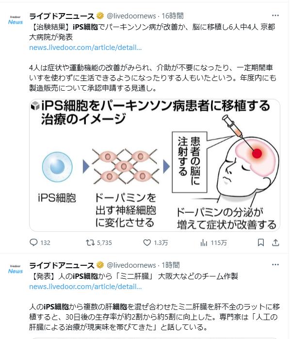 【朗報】iPS細胞、脳に移植し6人中4人がでパーキンソン病改善 2025/4/19 速報 1:名無しさん@おーぷん ips細胞すごいな document.write(” + ”); 関連記事 【地獄】小学生の娘が白血病→骨髄バンクで適合者16人見つかり大喜び→16人全員に断られて骨髄移植できず 【大悲報】ブタの臓器移植、無事黒歴史へ 【衝撃】父の右肺、母の左肺、祖父の肝臓を子供に同時移植 【地獄】慶応大「子宮を移植できるようにします!」女さん「……!?」シュバババババ 【速報】米で心臓移植をした男児(10)、2億の治療費が円安のせいで6億に跳ね上がってしまう document.write(” + ”); 続きを読む ——— Source: アルファルファモザイク 【朗報】iPS細胞、脳に移植し6人中4人がでパーキンソン病改善