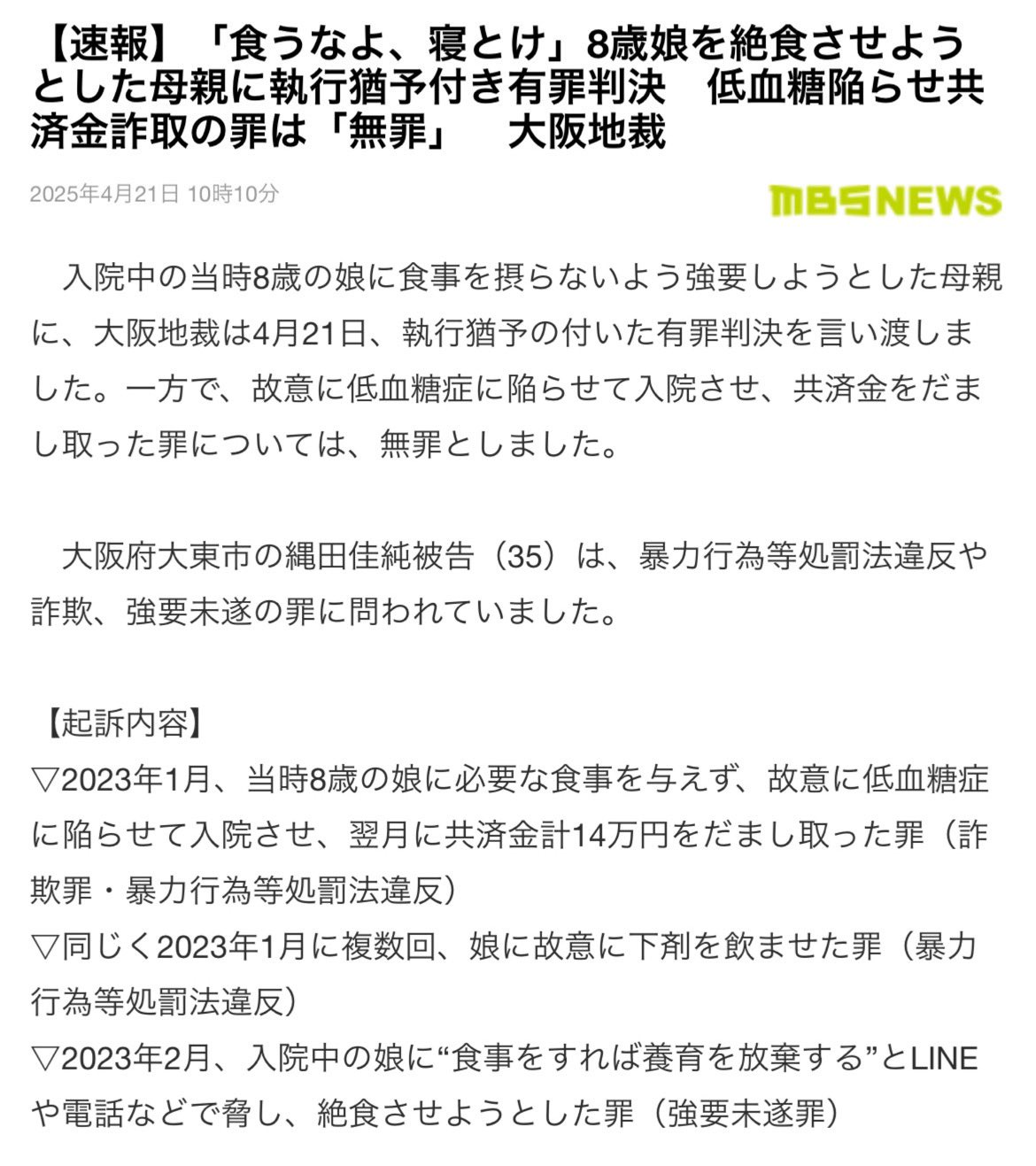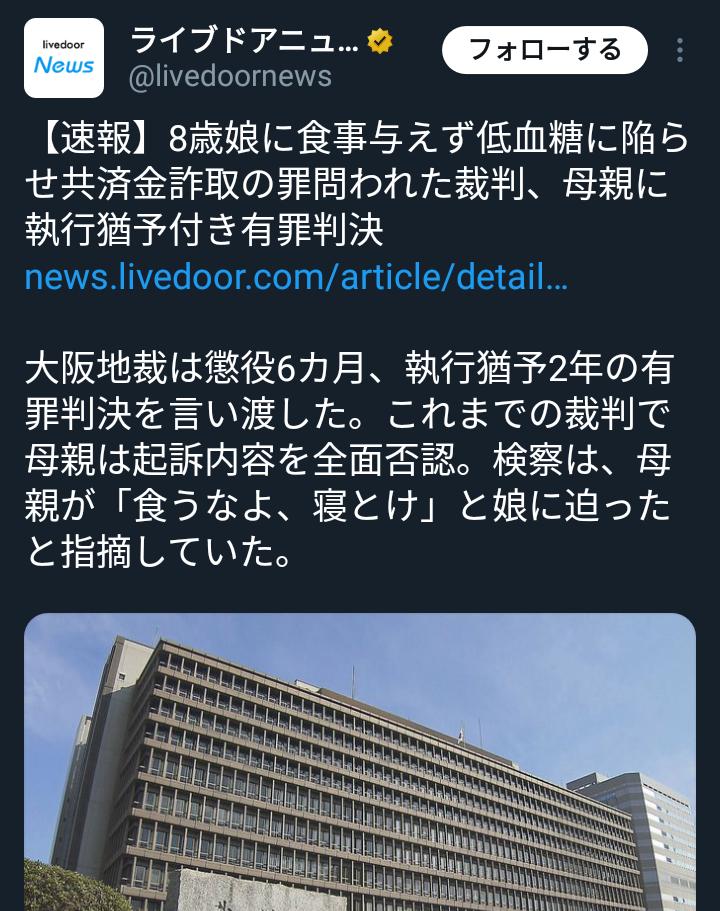 【悲報】女さん「食うなよ、寝とけ」 →8歳娘を絶食させ共済金計14万円をだまし取った母親、執行猶予wwwwwwwwwwwwwwwwwwwwwwww 2025/4/24 速報 1: 酷すぎるだろこれ… https://imgur.com/DeQVstr.jpeg document.write(” + ”); 関連記事 【朗報】ヤクザに因縁つけられてる仲間を救う為に893をぶっ殺したタイ人料理人、執行猶予5年の判決 【悲報】女さん、ウソの性被害申告で3000万円をタカるも失敗 → 実名不公表で執行猶予3年の判決 【純愛】JCを家に住まわせた女用務員、執行猶予→翌日JKに手を出し逮捕 【悲報】元棋士さん、懲役1年6ヶ月 執行猶予は4年 【衝撃】変態行為で逮捕された元共産党幹部に懲役1年執行猶予3年の判決 document.write(” + ”); 続きを読む ——— Source: アルファルファモザイク 【悲報】女さん「食うなよ、寝とけ」 →8歳娘を絶食させ共済金計14万円をだまし取った母親、執行猶予wwwwwwwwwwwwwwwwwwwwwwww