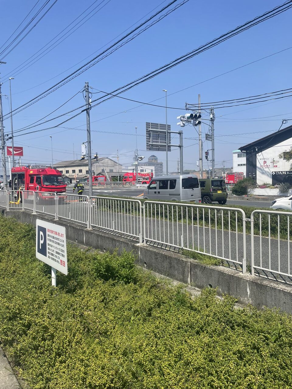 『香芝のユニクロに来たら、斜め向かいの工場?で火災。消防車、救急車、パトカーが続々と集まってきたので周辺渋滞しそう』